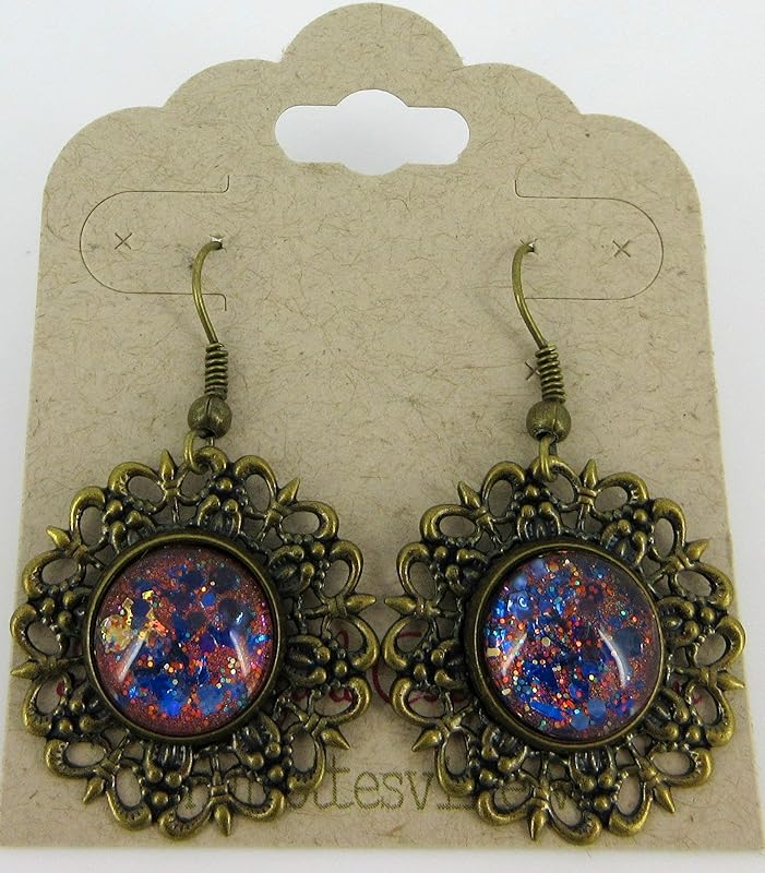 Summerfield Collection Antiqued Gold-tone Orange and Blue Glitter Glass Medallion Dangle Earrings Hand-painted