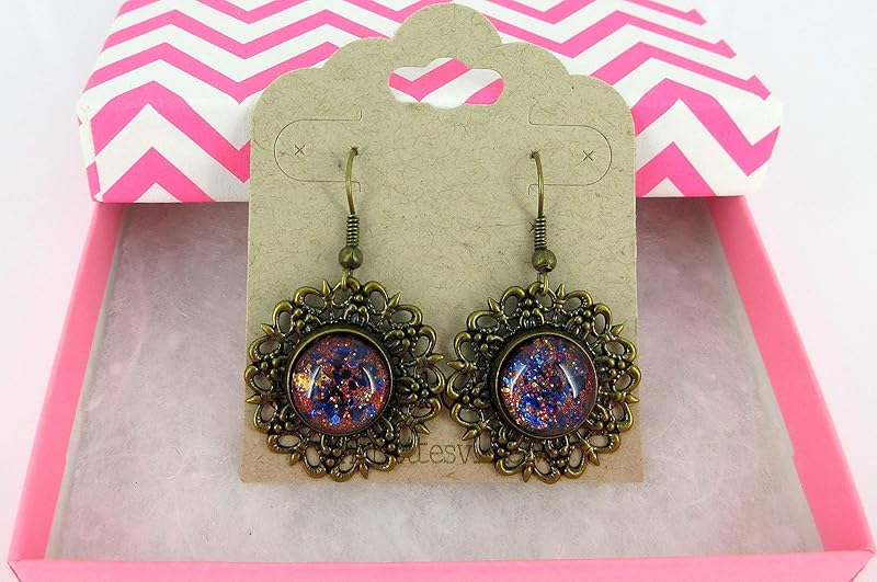 These lightweight earrings are so different! The stone diameter is appx. 1/2". Total earring width appx. 1". Total earring drop is appx. 1.5" L. Set in an antiqued gold-tone medallion disc bezel setting. Fish hook closure. These are really versatile and I'm sure will be a new favorite! In stock and ready to ship out. Comes in a gift box for easy gift-giving. They're so fun though, you might be tempted to keep them for yourself!