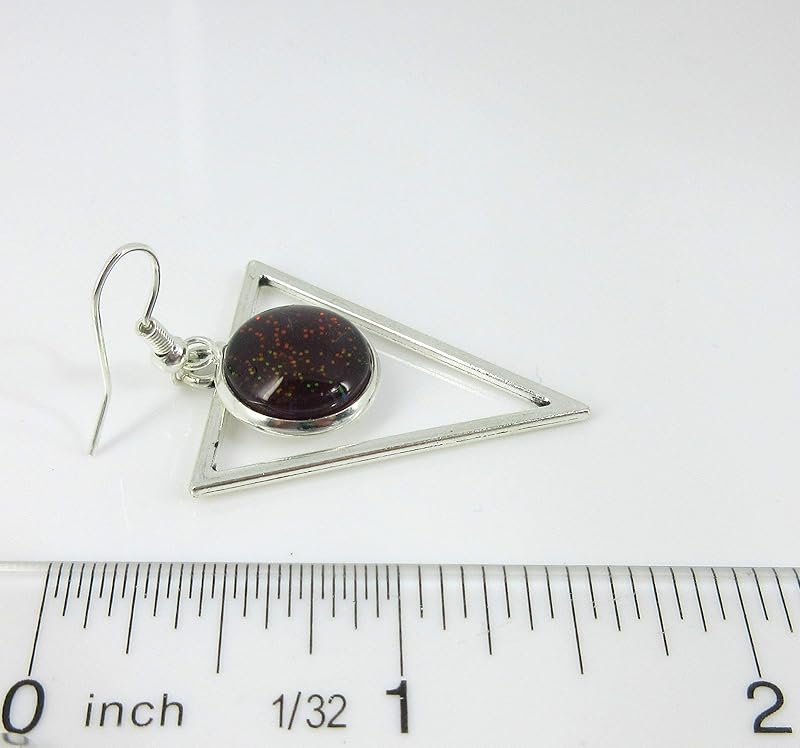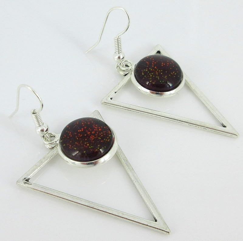These lightweight glass earrings are hand-painted with a metallic black base and are topped with subtle red, color-shifting, glitter flakes. The glass diameter is appx. 1/2". Total earring drop is appx. 1.75" L. Set in an antiqued silver-tone bezel setting. Fish hook closure. In stock and ready to ship out. Comes in a gift box for easy gift-giving. They're so unique though, you might be tempted to keep them for yourself!