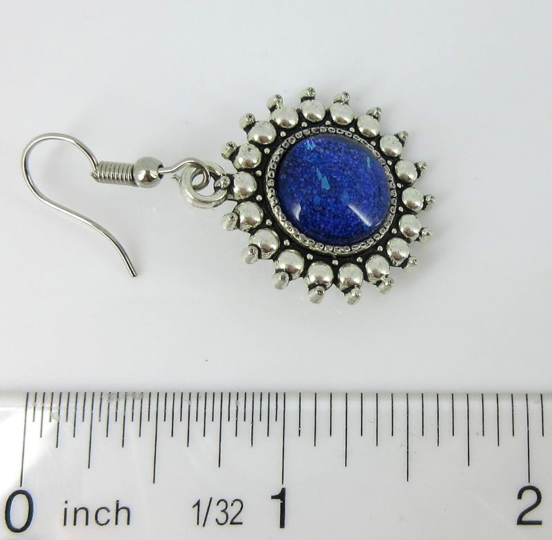 These glass earrings are hand-painted a dark blue base color and are topped with purple and blue glitter flakes in varying shapes and sizes. The glass diameter is appx. 1/2". Total earring drop is appx. 1.75" L. Set in an antiqued silver-tone bezel setting. Fish hook closure. In stock and ready to ship out. Comes in a gift box for easy gift-giving. They're so unique though, you might be tempted to keep them for yourself!