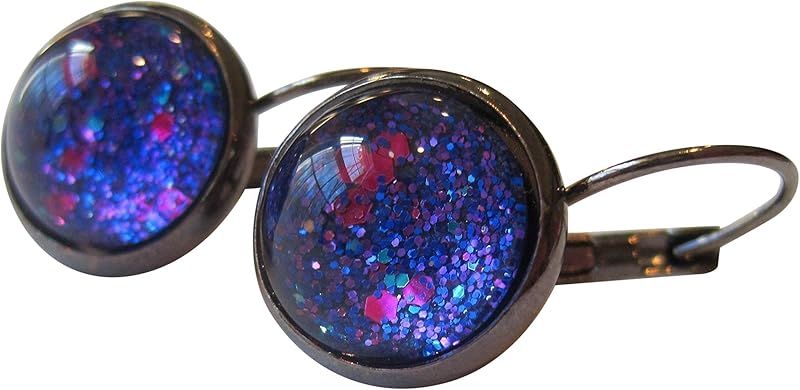 These colorful glass earrings have a navy blue base color and are topped with purple, magenta pink, aqua blue and navy blue glitter. The glass diameter is appx. 1/2". Total earring drop is appx. 1" L. Set in a shiny gunmetal hematite-tone round bezel setting. Lever-back closure. In stock and ready to ship out. Comes in a gift box for easy gift-giving. They're so unique though, you might be tempted to keep them for yourself!