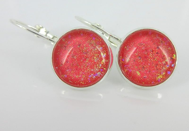 These colorful glass earrings have a great bright coral base color and reflect iridescent glitter. The glass diameter is appx. 1/2". Total earring drop is appx. 1" L. Set in a shiny silver-tone round bezel setting. Lever-back closure. In stock and ready to ship out. Comes in a gift box for easy gift-giving. They're so unique though, you might be tempted to keep them for yourself!