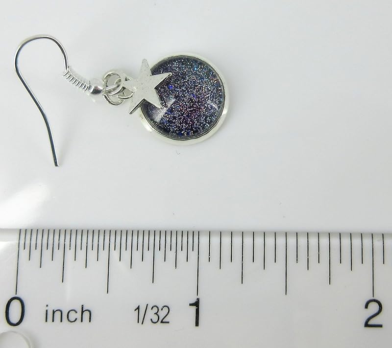 These sparkly glass earrings are mainly blue, with some purple swirls, and micro holographic silver glitter flakes. The glass diameter is appx. 1/2". Total earring drop is appx. 1 3/8" L. Set in a shiny silver-tone bezel setting with a cute little star charm. Fish hook closure. In stock and ready to ship out. Comes in a gift box for easy gift-giving. They're so unique though, you might be tempted to keep them for yourself!